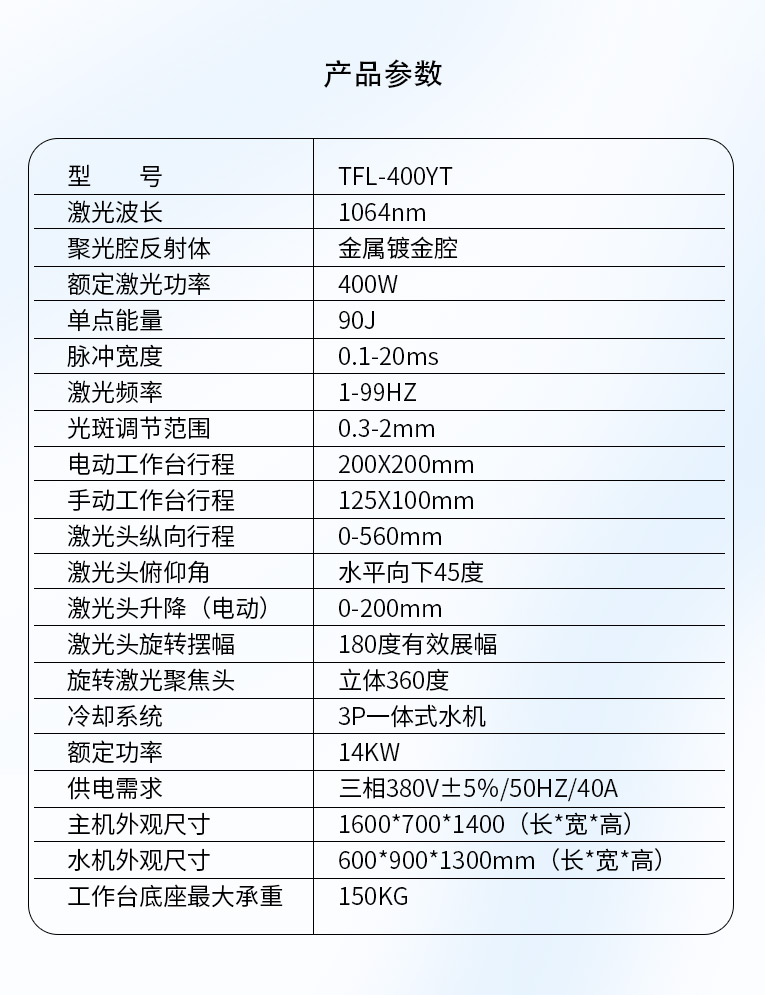 通發激光一體式模具激光焊機TFL-400YT是一款多種功能融合一體的新型模具激光焊接機,針對特大型塑料模具激光焊、中型注塑模具激光燒焊、小型塑膠模具激光補焊、壓鑄模激光補焊具等各類模具可實現超精密修復,幫您解決大型汽車模具修復難題,不需要模具移動,電動工作臺與立體旋轉激光頭完美結合,操作桿控制運動移動實現輕松激光修復大型模具,同時也保留了傳統手動工作臺超精密修復模具功能。